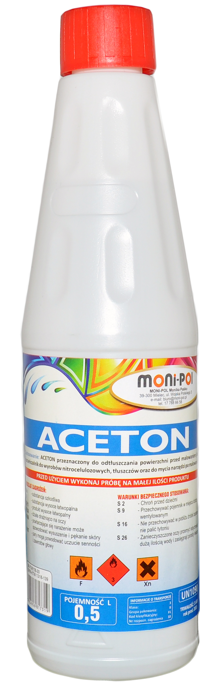 Aceton służy do rozpuszczania tłuszczów, olejów, żywic, wosków i nitrocelulozy. Idealny do odtłuszczania powierzchni przed malowaniem, a także do mycia pędzli i narzędzi po malowaniu.