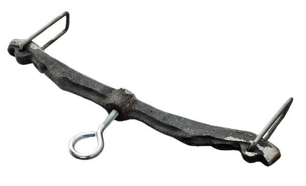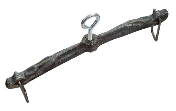 Belka, uchwyt żeliwny do kociołka żeliwnego ze śrubą dociskową zakończoną kółkiem.