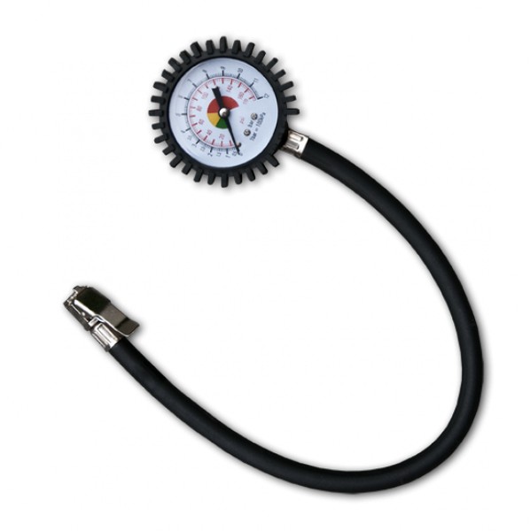 Ciśnieniomierz do opon wyposażony w wąż i końcówkę do wentyla.
