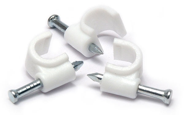 Uchwyt do przewodów okrągłych wykonany z polietylenu PE-HD wraz z hartowanym gwóździem jako element mocujący.