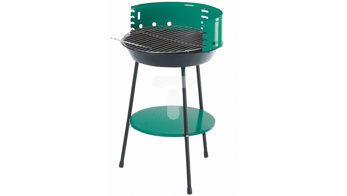 Grill okragły z rożnem. Korpus i ruszt wykonany ze stali emaliowanej. W zestawie owiewka i półka na akcesoria.