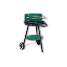 Grill okragły z rożnem na kółkach. Korpus i ruszt wykonany ze stali emaliowanej. W zestawie owiewka i półka na akcesoria. Posiada regulację wysokości rusztu.