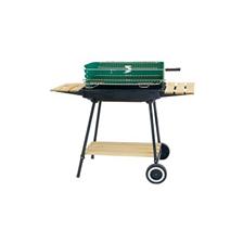 Grill prostokątny z rożnem na kółkach. Korpus i ruszt wykonany ze stali chromowanej. Posiada dwie boczne półki. W zestawie misa, owiewka, dolna półka i półka na akcesoria.