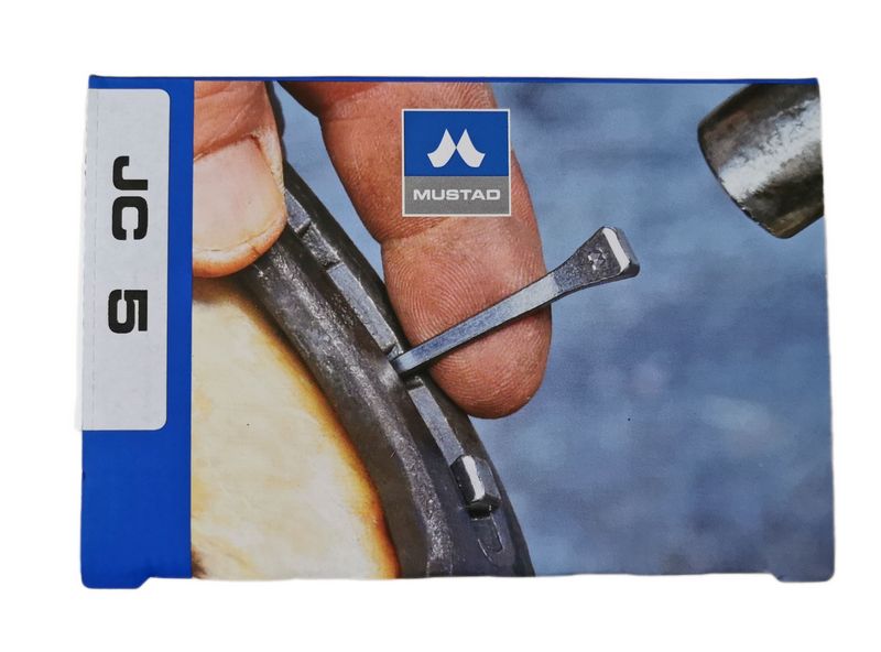 Bardzo dobrej jakości gwoździe do podków z płaską główką. Wyrób znanej szwedzkiej firmy Mustad. JCF to kwadratowy, ale płaski typ główki, który po przybiciu mało wystaje ponad podkowę.