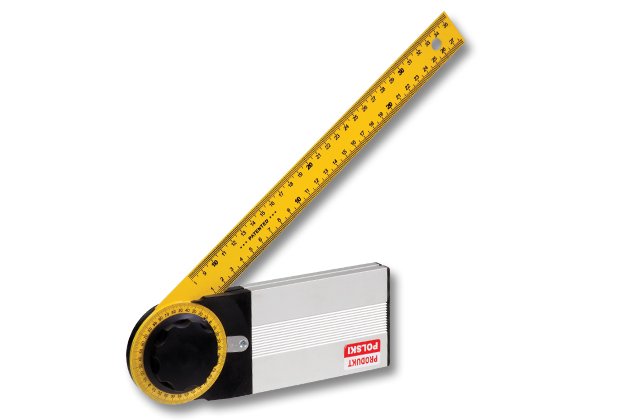 Kątownik nastawny z podziałką. Ramię kątownika metalowe z naniesioną czterostronnie podziałką metryczną. Posiada pokrętło z tworzywa sztucznego do blokowania ramion.