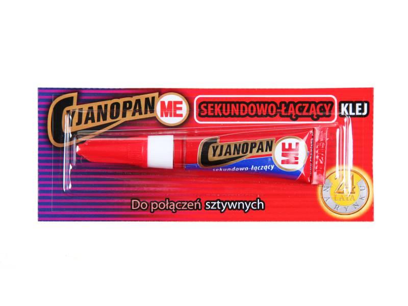 Cyjanopan ME czerwony jest jednoskładnikowym, bezrozpuszczalnikowym klejem cyjanoakrylowym o bardzo szybkim działaniu. Utwardzanie się spoin polega na gwałtownej polimeryzacji pod wpływem wilgoci obecnej na łączonych elementach. Klej jest idealny do połączeń sztywnych i można nim łączyć metale, gumę, szkło, ceramikę, drewno oraz tworzywa sztuczne. Doskonały do drobnych prac modelarskich, wymagajacych szybkich połączeń. Łączy w zależności od rodzaju materiału, w 15 do 30 sekund.