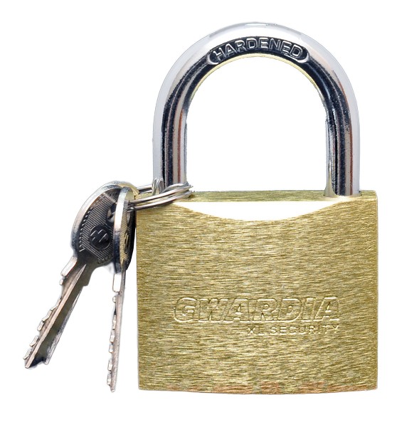 Kłodki mosiądzowane GWARDIA. Posiadają gruby korpus i hartowany pałąk. Kłódki nadają się do stosowania w wilgotnych i narażonych na deszcz warunkach: działka, łódki, las itp.