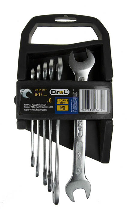 Zestaw sześciu kluczy płaskich firmy Drel wykonanych z wysokiej jakości stali chromowo-wanadowej. Zakończenia kluczy ustawione pod kątem 15o dla optymalnego dostępu do elementu odkręcanego. Klucze kute na zimno, pakowane w plastikowym pojemniku.