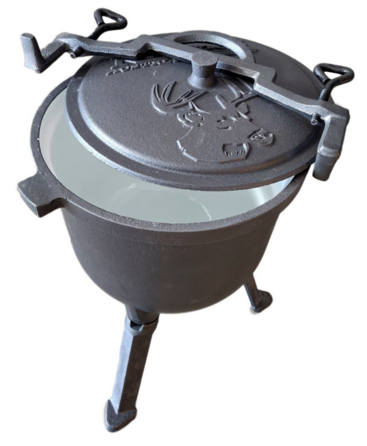 Kociołek żeliwny został wykonany z wysokiej jakości odlewu. Jest mocny i solidny. Można go zawiesić nad ogniskiem lub postawić bezpośrednio na nim, a dzięki odkręcanym nóżkom również na piecu, na palniku gazowym lub w piekarniku.
