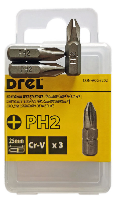 Komplet trzech sztuk końcówek PH2 firmy Drel do wkrętarek. Utwardzane, hartowane CrV.