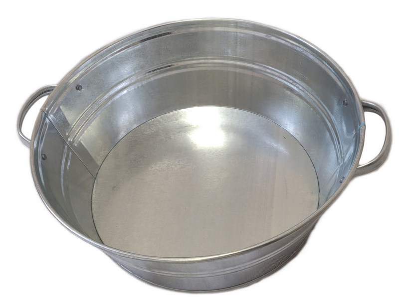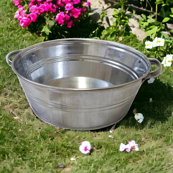 Okrągła miska z uchwytami wykonana z lekkiej blachy ocynkowanej, odpornej na działanie czynników atmosferycznych, korozję i uszkodzenia mechaniczne.