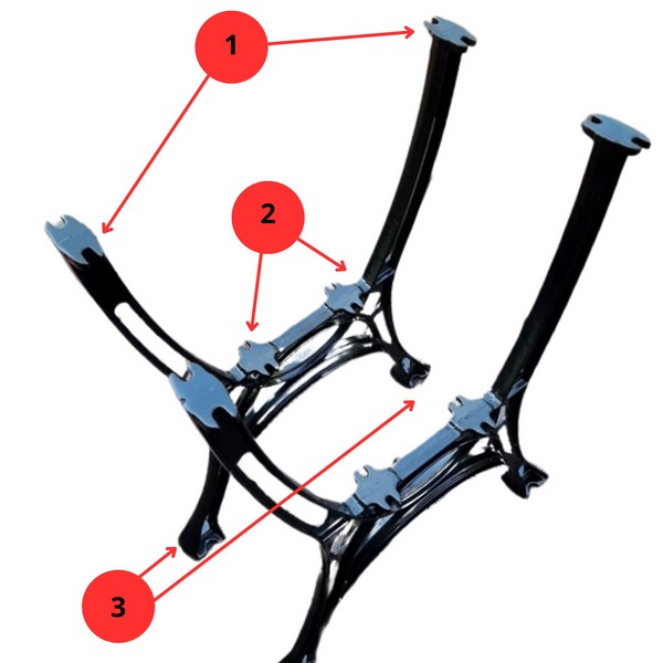 Noga przygotowana jest pod montaż 2 desek/belek, stanowiących oparcie/stelaż dla blatu właściwego oraz 2 desek podblatowych stabilizujących konstrukcję i dodatkowo funkcjonalnych. Nie ma potrzeby żadnego nawiercania i robienia otworów. Otwory są wymierzone i gotowe pod konstrukcję.