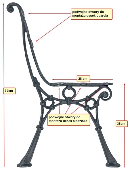 Noga przygotowana jest pod montaż 5 desek, 2 na oparcie i 3 na siedzisko. Nie ma potrzeby żadnego nawiercania i robienia otworów. Otwory są wymierzone i gotowe pod konstrukcję.