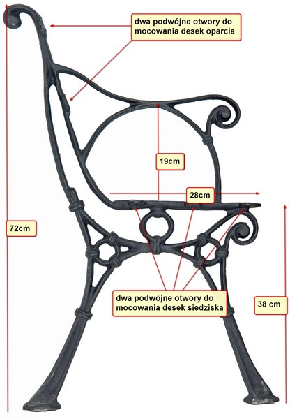 Noga przygotowana jest pod montaż 5 desek, 2 na oparcie i 3 na siedzisko. Nie ma potrzeby żadnego nawiercania i robienia otworów. Otwory są wymierzone i gotowe pod konstrukcję.