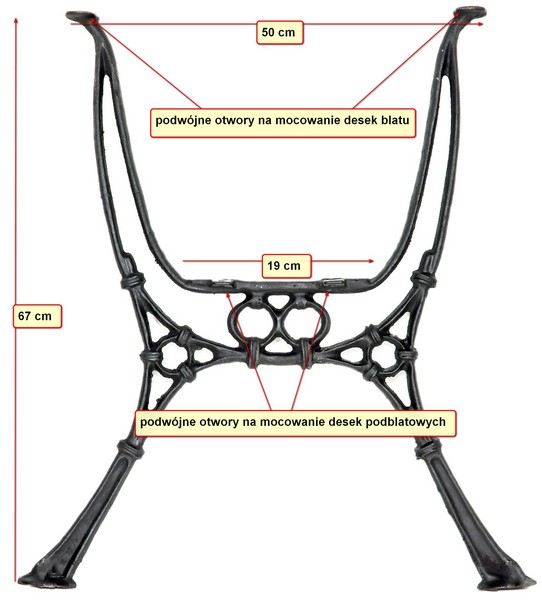 Noga przygotowana jest pod montaż 2 desek/belek, stanowiących oparcie/stelaż dla blatu właściwego oraz 2 desek podblatowych stabilizujących konstrukcję i dodatkowo funkcjonalnych. Nie ma potrzeby żadnego nawiercania i robienia otworów. Otwory są wymierzone i gotowe pod konstrukcję.