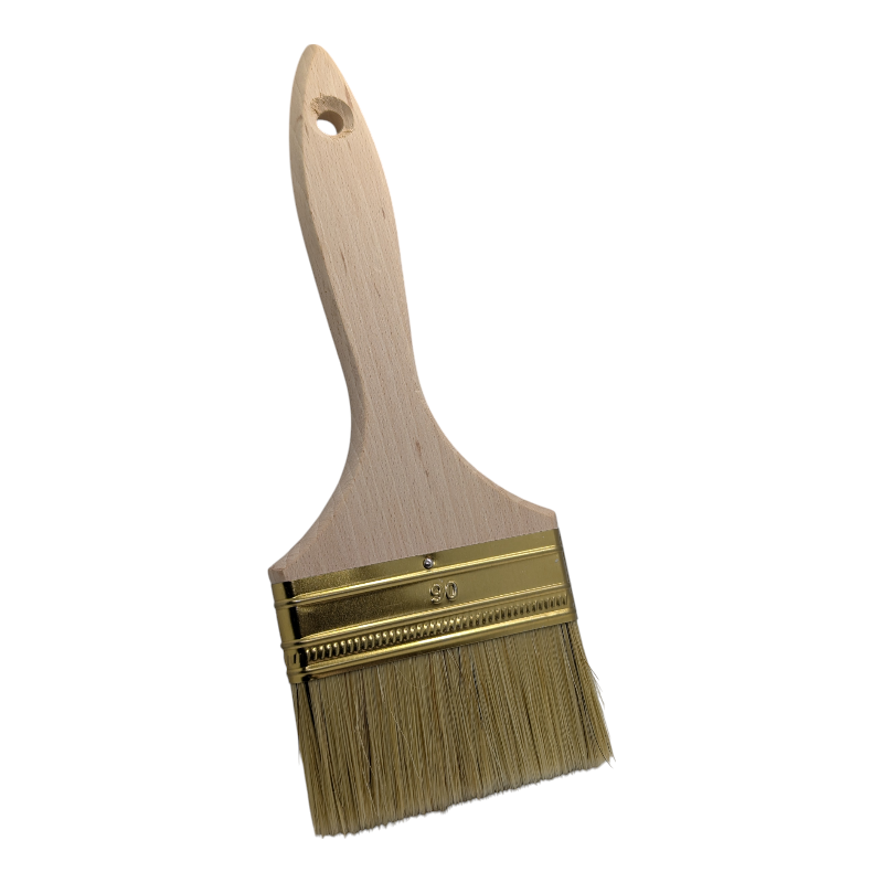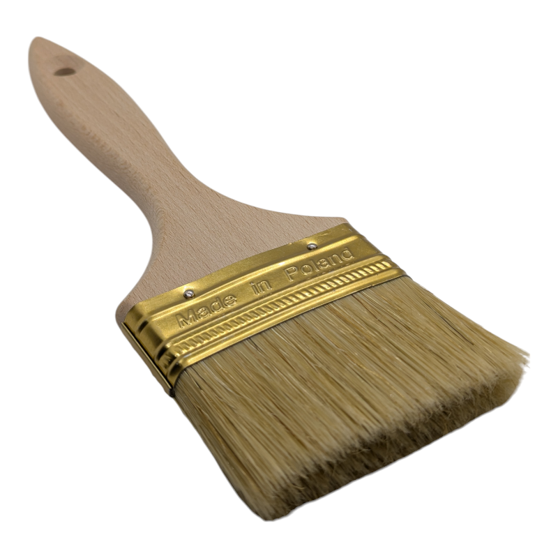 Płaski pędzel typu angielskiego. Wyrób krajowy z włosia świńskiego. Skuwka wykonana z cynowanej blachy stalowej, trzonek z drewna bukowego.