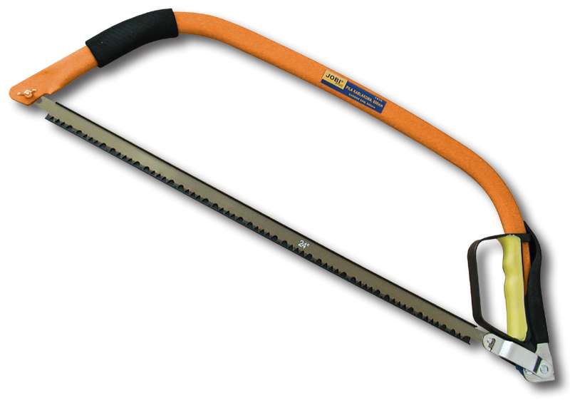 Piła kabłąkowa JOBI. Solidnie wykonana, ze stalowego profilu, stabilny kabłąk z brzeszczotem do cięcia mokrego drewna. Brzeszczot hartowany o specjalnie dobranej podziałce i kształcie zębów. Piła wyposażona jest w wyprofilowany, poprawiający ergonomię uchwyt z osłoną dłoni oraz mechanizm umożliwiający szybką wymianę brzeszczota.
