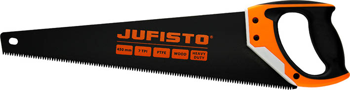 Piła ręczna do cięcia drewna firmy Jufisto. Posiada trójstronnie ostrzone, hartowane zęby, a także uchwyt dwukompozytowy.