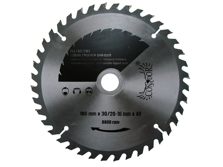 Piła tarczowa do pilarki firmy Condor. Tarcza przeznaczona do cięcia drewna zarówno twardego, jak i miękkiego, płyt gipsowych, wiórowych i materiałów izolacyjnych.