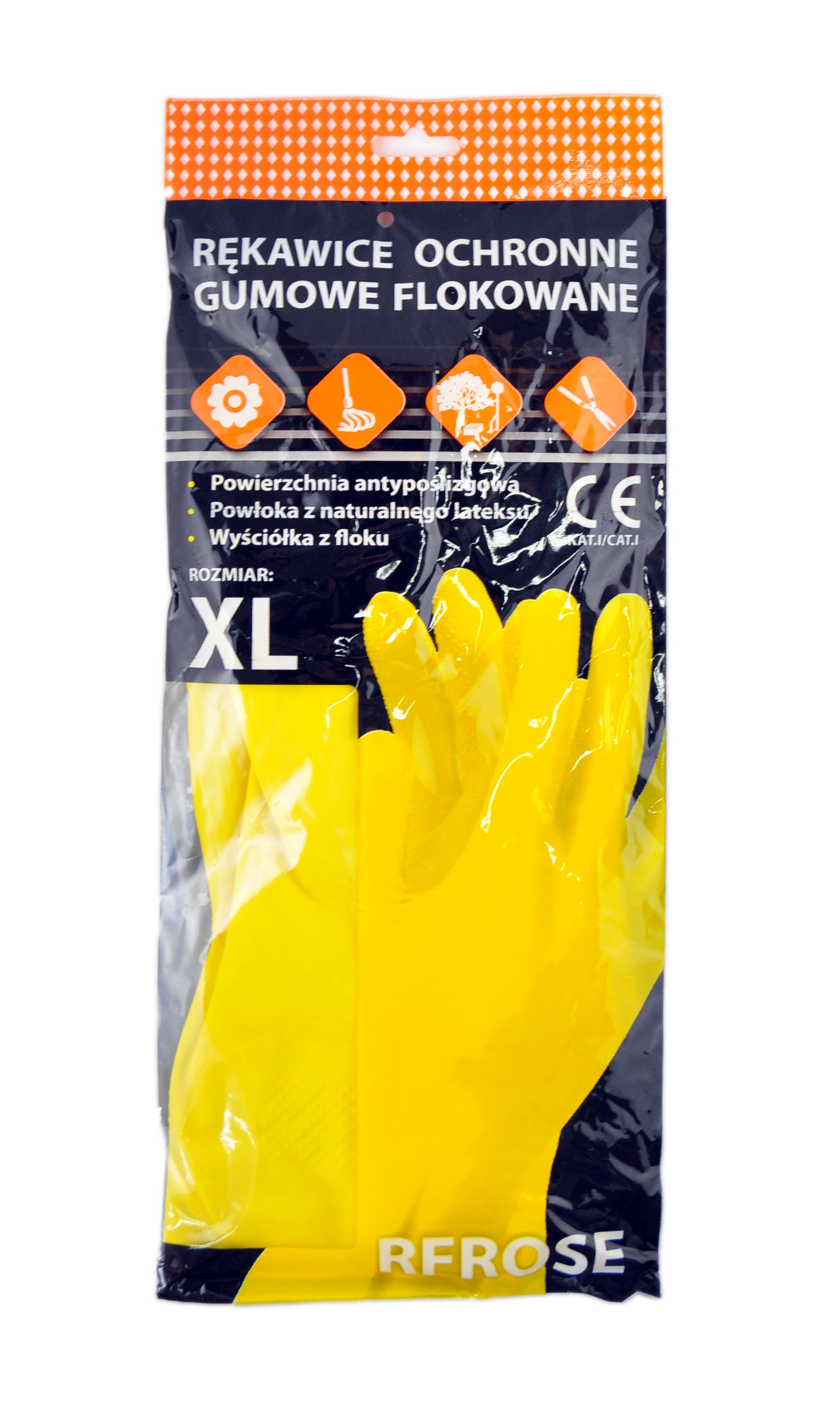Rękawice ochronne, gumowe i flokowane potocznie zwane jako floki lub rękawice gospodarcze. Wewnętrzna powierzchnia pokryta flokiem (pyłem bawełnianym), co ułatwia wkładanie i zdejmowanie rękawic oraz zapobiega poceniu się rąk w czasie użytkowania. Na części chwytnej chropowata struktura dzięki czemu rękawiczki zyskują lepszą przyczepność. Wysoka odporność na detergenty i środki piorące, odporne na rozciąganie. Rękawice wykorzystywane do ogólnych prac mechanicznych, doskonałe w gospodarstwach domowych.