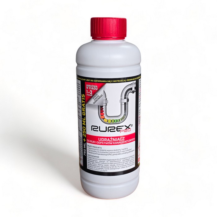 RUREX PRO to preparat nieorganiczny oparty na kwasie siarkowym z dodatkiem środków o właściwościach czyszczących, stworzony do udrożniania rur i odpływów kanalizacyjnych. Jego silne właściwości utleniające pozwalają rozpuścić trudne do usunięcia zabrudzenia, takie jak resztki jedzenia, włosy, paznokcie, tłuszcze, papier, tkaniny, czy odpady celulozowe.