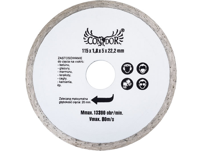 Tarcza diamentowa ciągła firmy Condor. Przeznaczona jest do przecinania klinkieru oraz ceramiki, dzięki czemu znajdzie szerokie zastosowanie w dziedzinie remontowo-budowlanej. Produkt został wykonany ze stali, przez co na długo zachowuje fabryczne parametry. Tarcza pozwala na wykonywanie precyzyjnych cięć, zapewniając jednocześnie gładką powierzchnię obrabianych krawędzi. Umożliwia cięcie płytek i elementów ceramicznych bez odprysków.