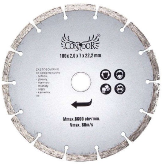 Tarcza diamentowa, segmentowa firmy Condor. Przeznaczona do cięcia na sucho materiałów tj. beton, glazura, marmur, terakota, cegła, kamień itp.