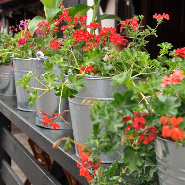 wiaderka mogą posłużyć jako doniczki dla ozdobnych roślin balkonowych, a