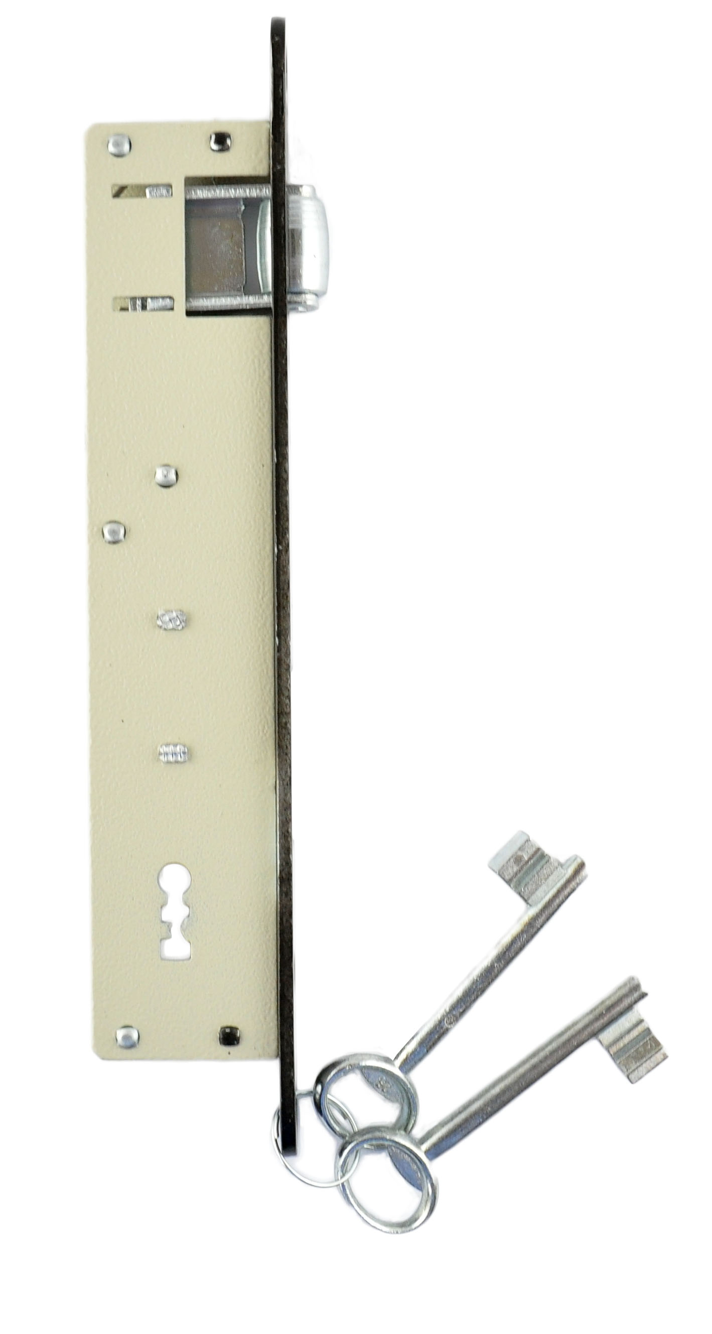 Zamek bramowy wąski firmy JANIA. Zamek typu "Rolka" na klucz prawy lub lewy. Zamki wpuszczane przeznaczone są do montowania w środku drzwi, we wcześniej przygotowanych do tego otworach. Po zamknięciu zamka jego rygiel i zapadka wchodzą do okucia/zaczepu zamontowanego w futrynie. Zamek nie ma możliwości zamiany strony z lewego na prawy i odwrotnie.