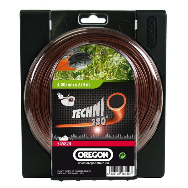 Żyłka do kos spalinowych OREGON® Techni 280° wyróżnia się do 30% większą wytrzymałością od wiodących na rynku nylonowych żyłek o profilu okrągłym. Produkowana z wysokiej klasy polimeru 6/66 i wzmocniona grubym rdzeniem z myślą o profesjonalnych użytkownikach kos spalinowych i koszeniu w trudnych warunkach. Z łatwością ścina grube łodygi wysokich traw, chwastów i zarośli. W każdym opakowaniu żyłki tnącej Techni 280° znajduje się praktyczny nożyk do jej przecinania.